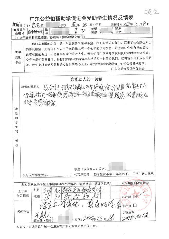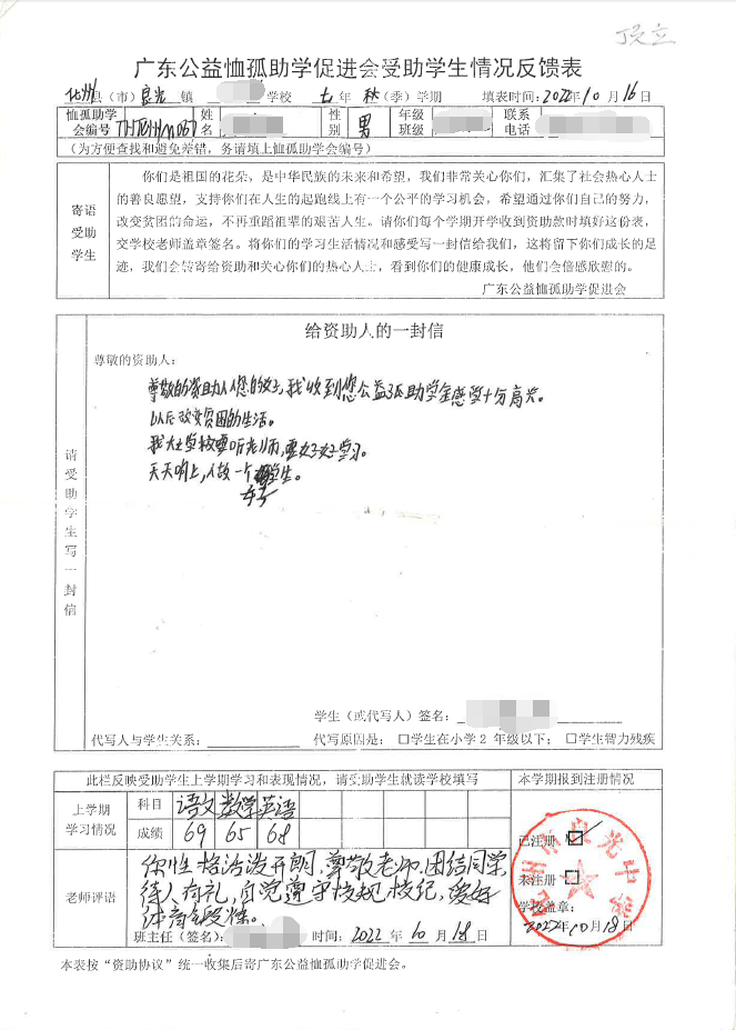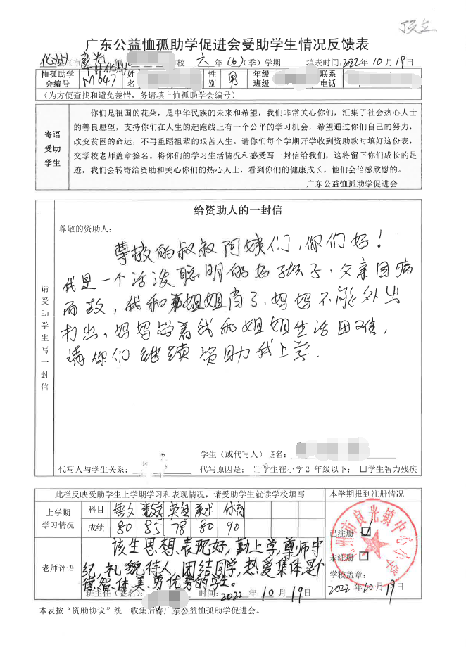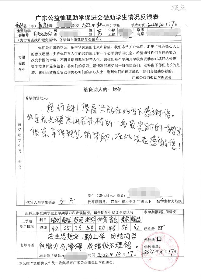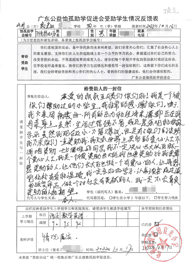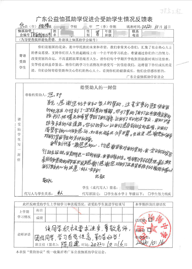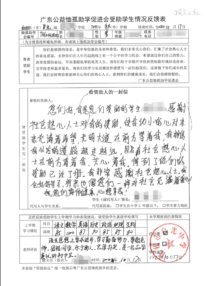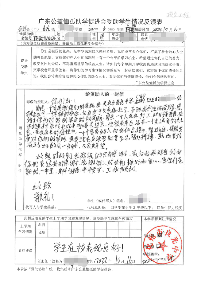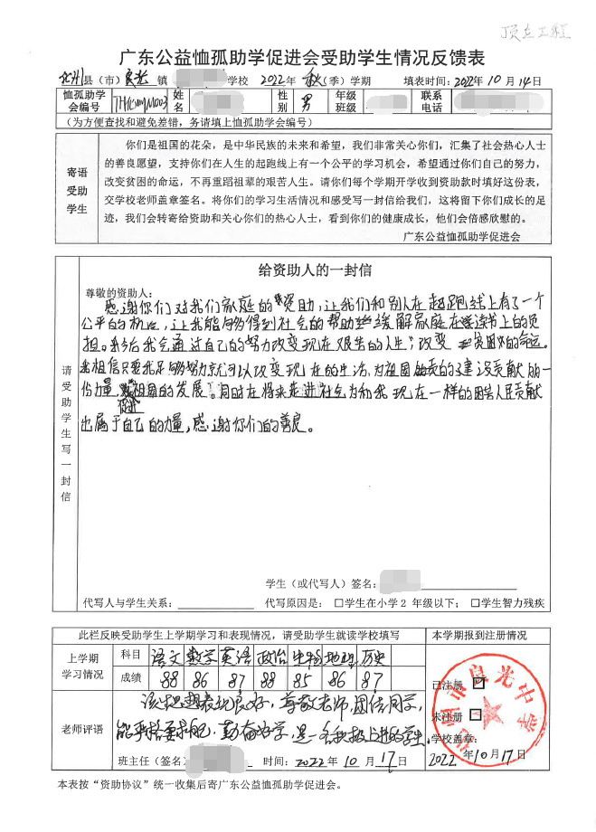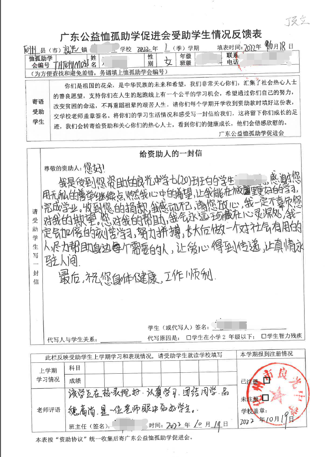 2022年7月,公司了解到廣東公益恤孤助學促進會舉辦慈善助學活動之后,發(fā)起了公司內部慈善捐款活動,員工們積極參與,紛紛捐款,向有需要的學生奉獻愛心,向他們表達一份關愛。也許我們的愛心微不足道,但卻緩解了他們在學業(yè)上一定程度的經(jīng)濟壓力,改善了他們的學習和生活環(huán)境,也給他們帶來了希望。近期,廣東公益恤孤助學促進會將學生情況反饋表及受助學生對捐助人的一封信郵寄到公司,反饋了受助學生的學習生活情況,反饋表及信函里記錄著受助學生對學習的熱愛,也表達著他們對捐助人的感激之情,可以說我們小小的舉動給他們帶來了莫大的支持。